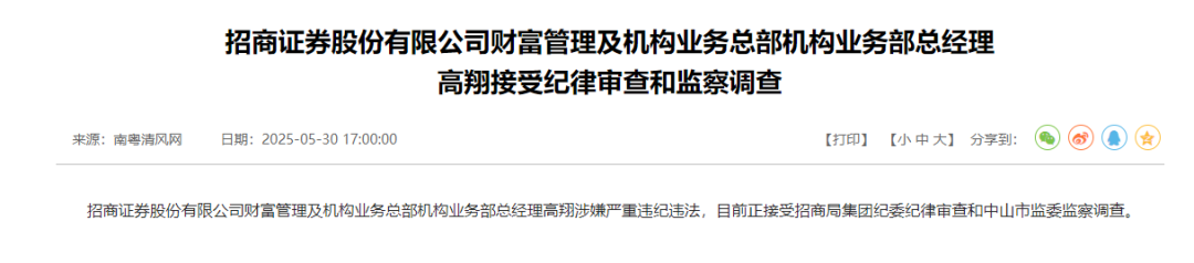 今年5月,南粤清风网曾发布消息,招商证券财富管理及机构业务总部机构业务部总经理高翔涉嫌严重违纪违法,目前正接受招商局集团纪委纪律审查和中山市监委监察调查。
